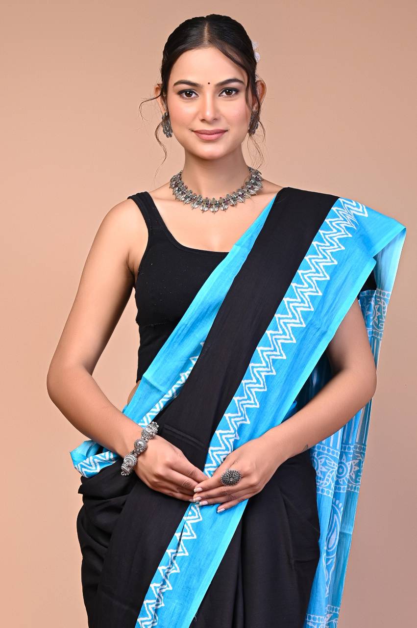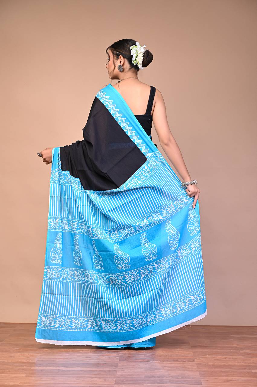 The Still Water holds its calm until the light hits — a pure black body given a flash of life by a bright turquoise Dabu-printed border, like sunlight catching the surface of still water without warning.