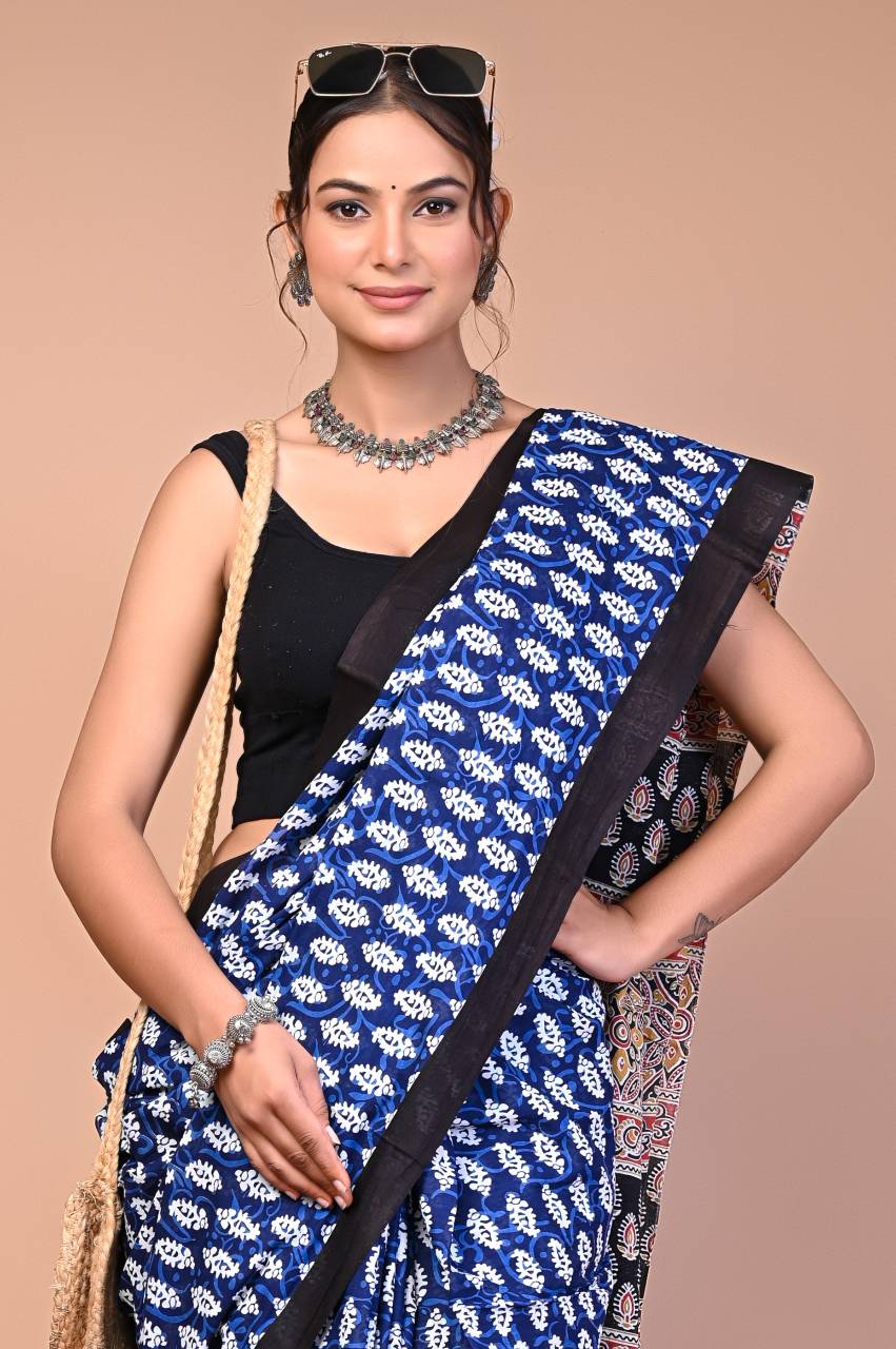 The Whisper & Thunder is a saree of two moods — a royal blue body covered in delicate white Dabu leaf butis that whisper softly, leading into a dramatic black Ajrakh pallu that thunders with red and white traditional motifs.